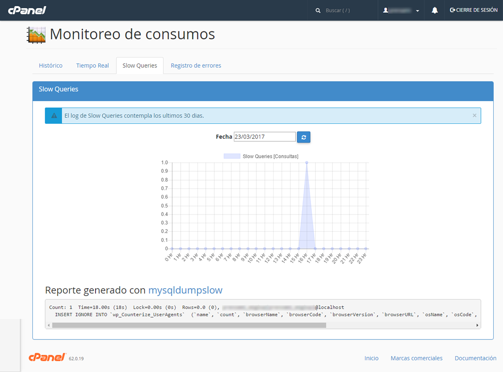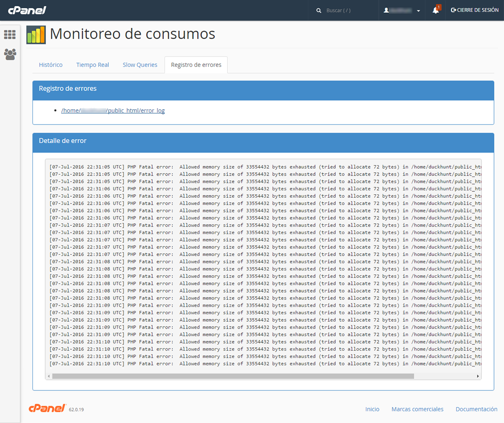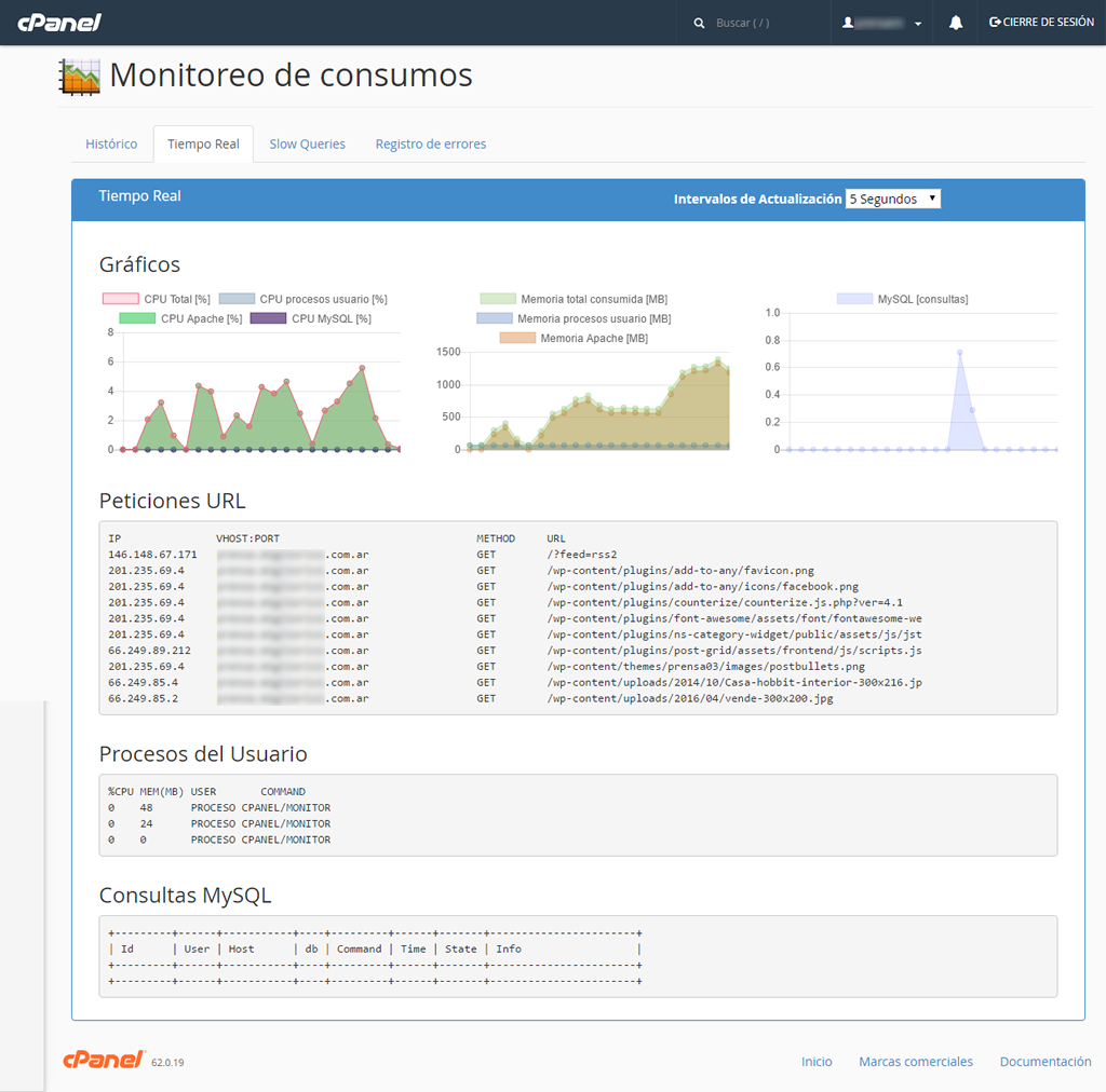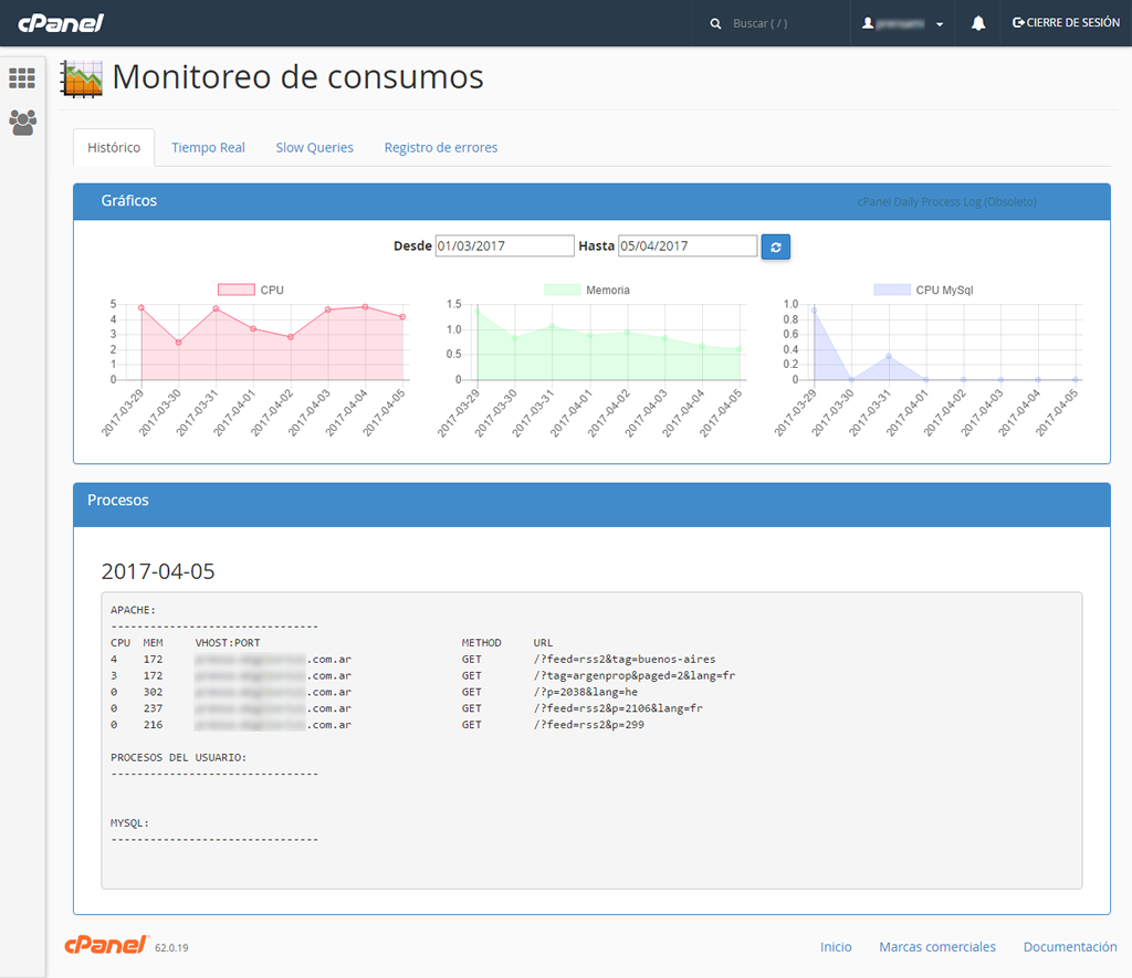 Con esta herramienta exclusiva vas a poder conocer los consumos de CPU y memoria en tiempo real, un histórico, un log de errores de programación que se registraron en tu sitio y hasta las slow queries si estás utilizando bases de datos MySQL, de manera que puedas resolver problemas de manera rápida y optimizando al máximo tus scripts para que consuman lo menos posible.