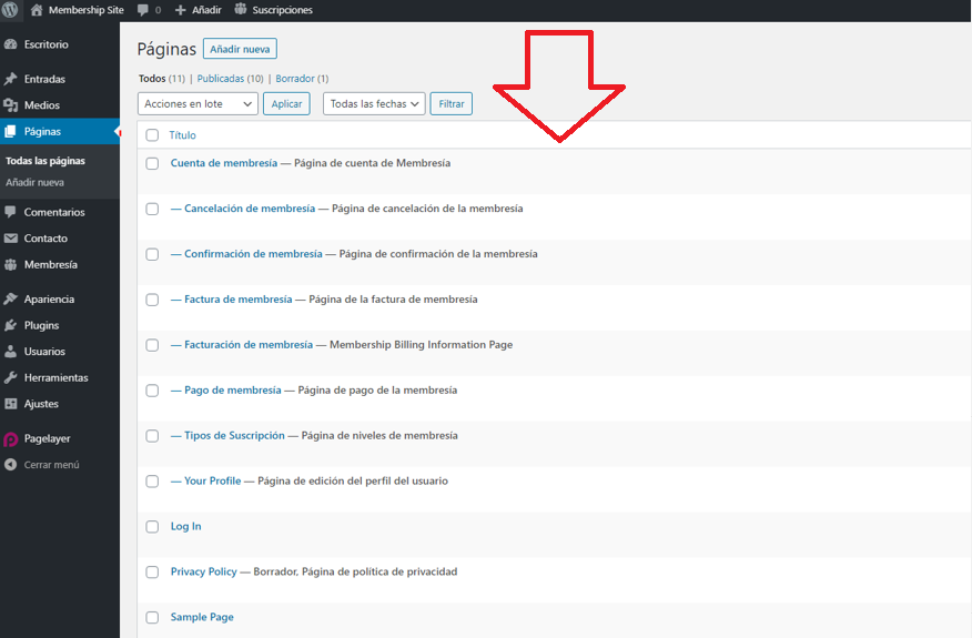 Ahora, si luego vas a la sección Páginas de tu WordPress, verás que se han creado entre las que ya tenías o las páginas por defecto que se crean al instalar.