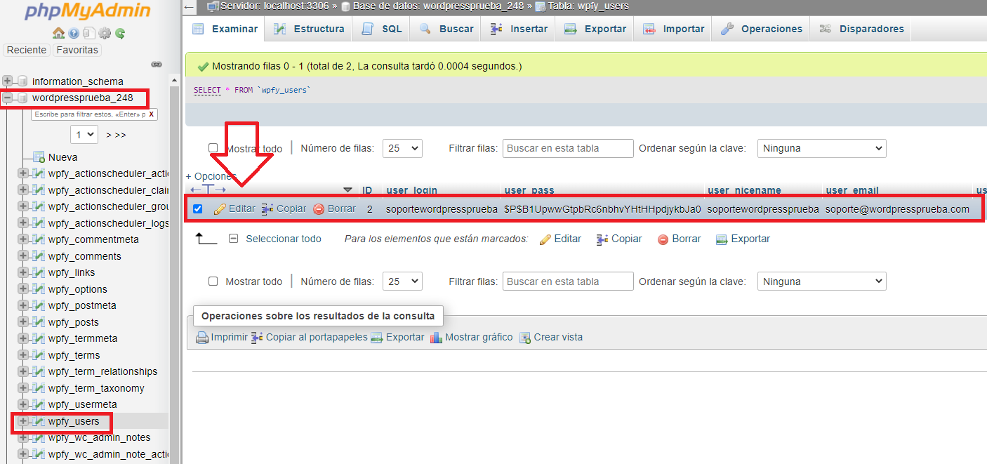Luego, deberás buscar la base de datos correspondiente a tu WordPress, seleccionar la tabla wp_users (o el prefijo más “_users”) y editar el usuario con el que normalmente ingresas.